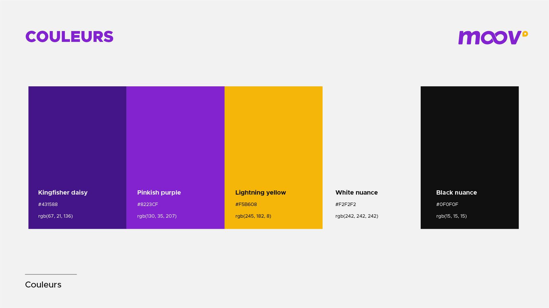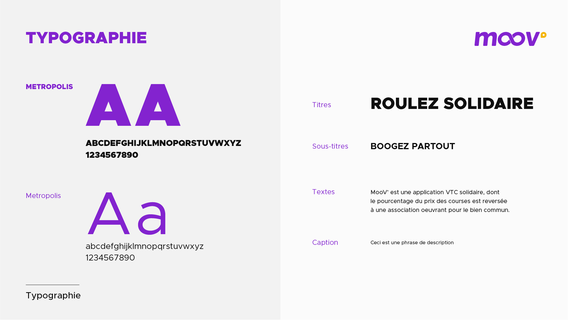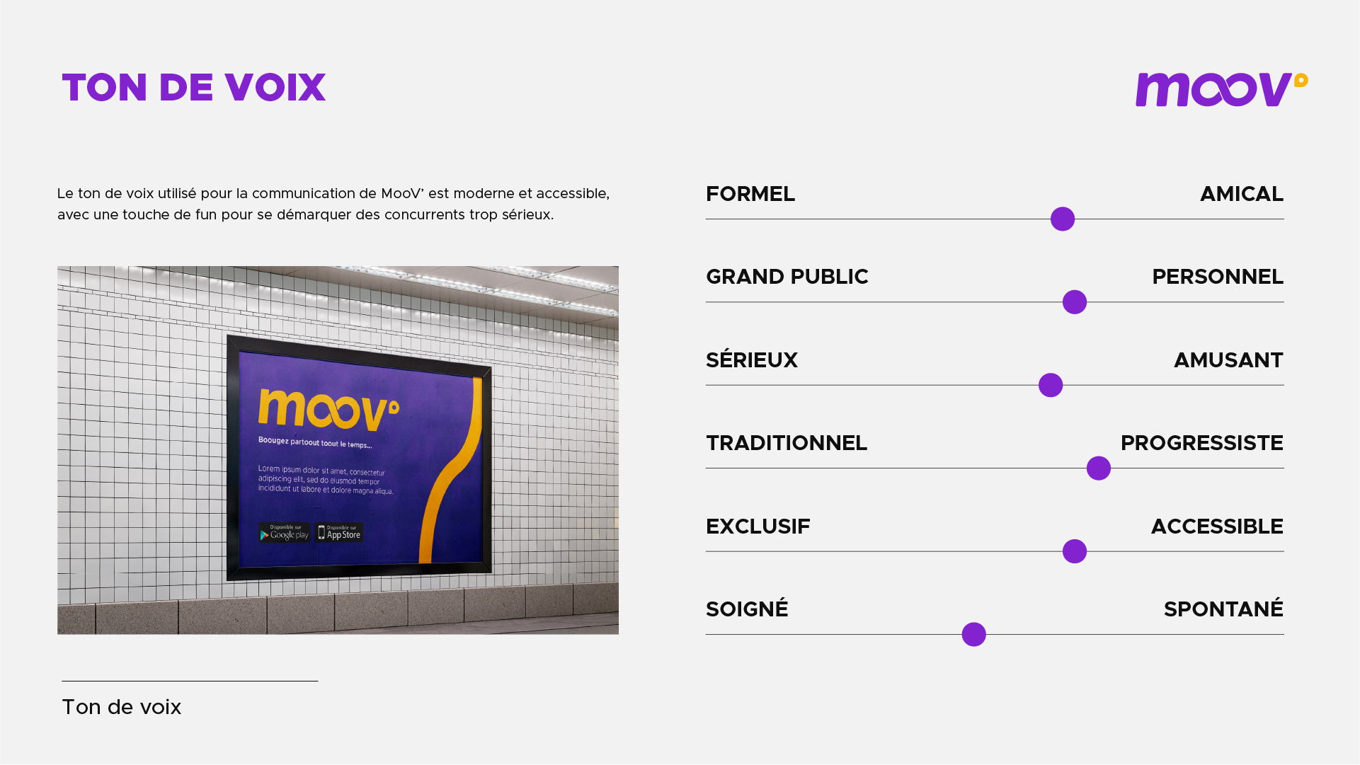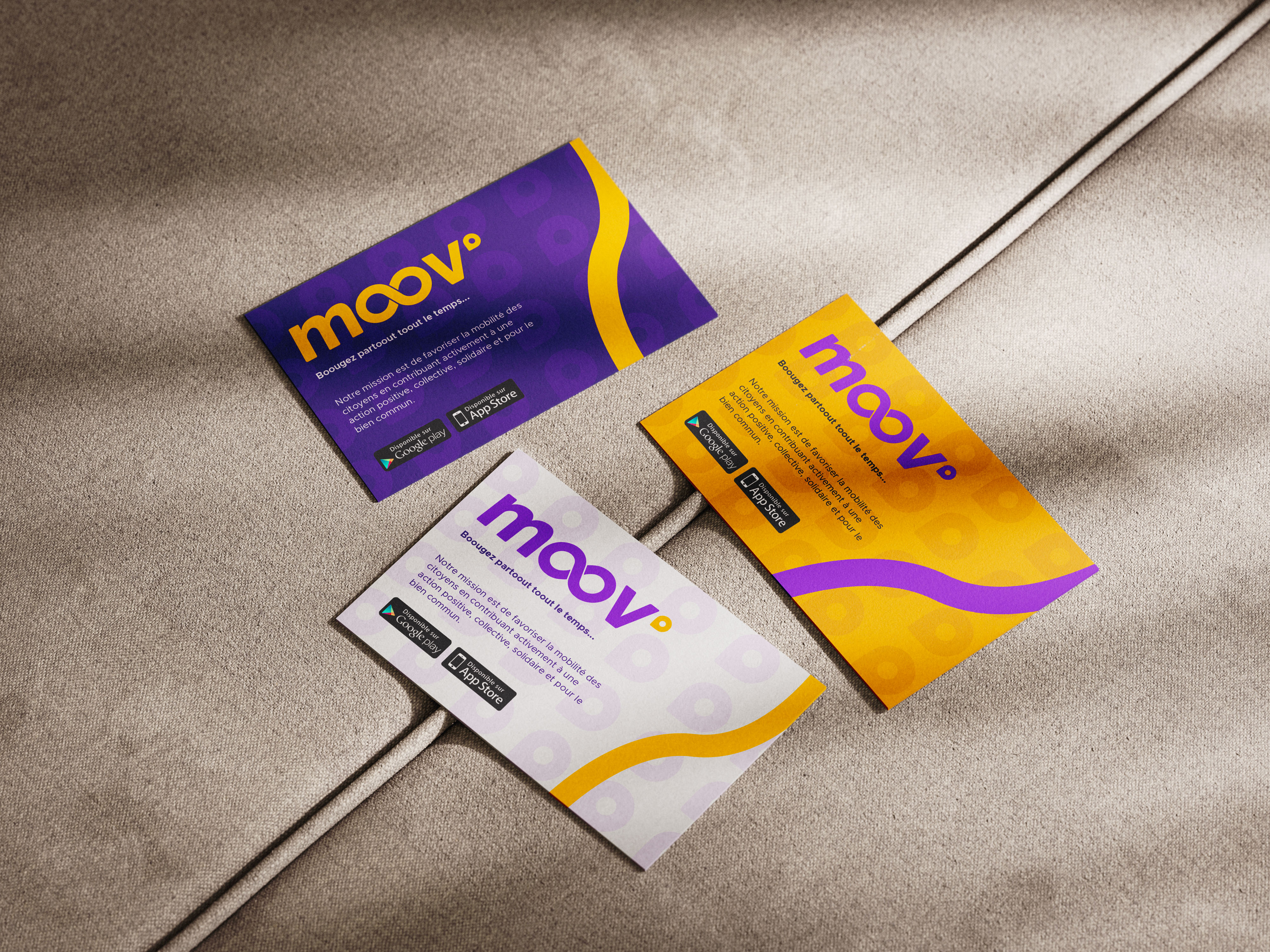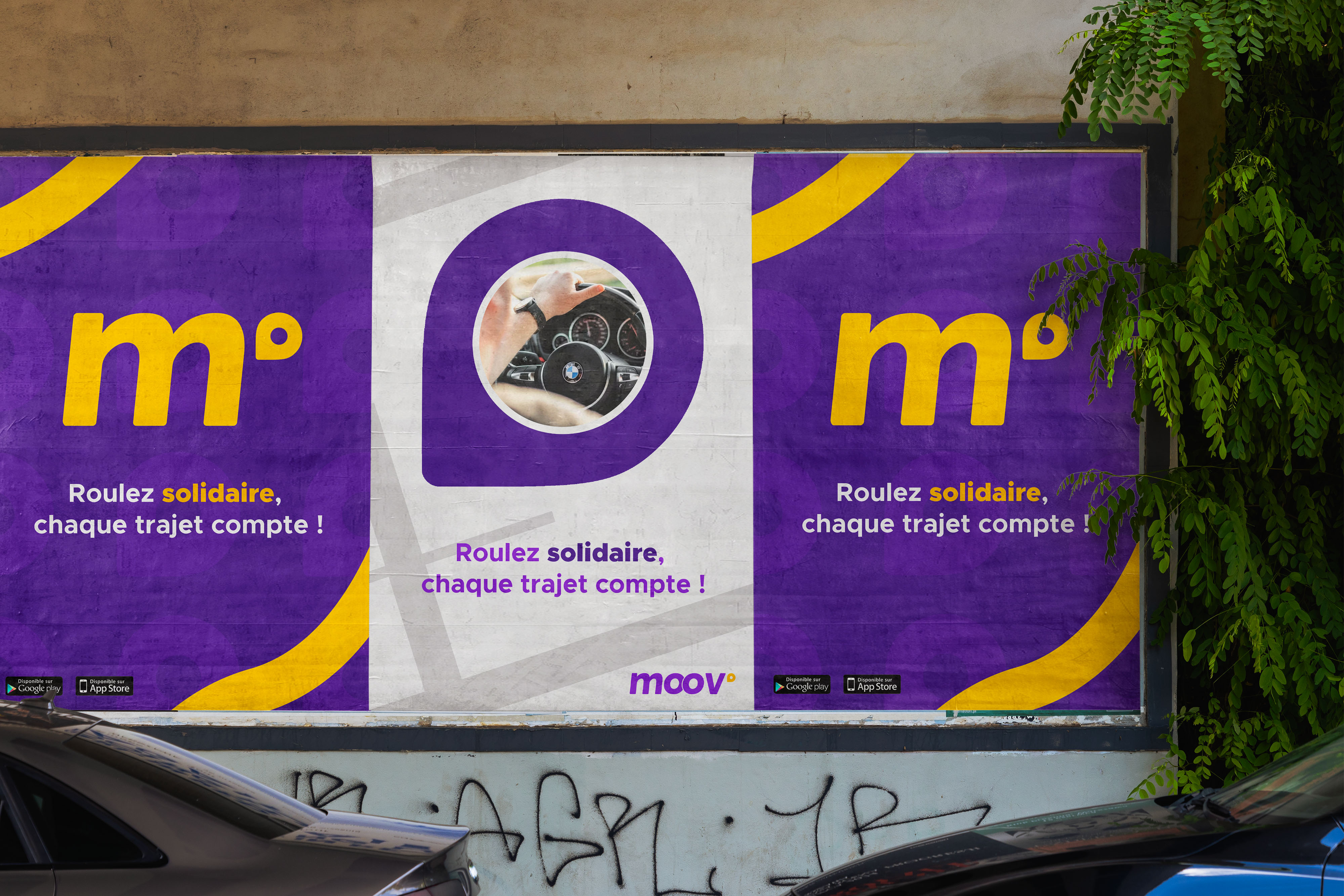 Moov’ is a french solidarity car-hailing app, a price percentage of each ride is donated to an association working for the common good and for the La Ligue des Quartiers project. The app offers a courier service available anywhere and at all times. To reflect the dynamics of the project, Moov’ aims to be modern with a recognizable logo and colors. The tone used will be both catchy and fun, to build customer loyalty and enable impactful communication.